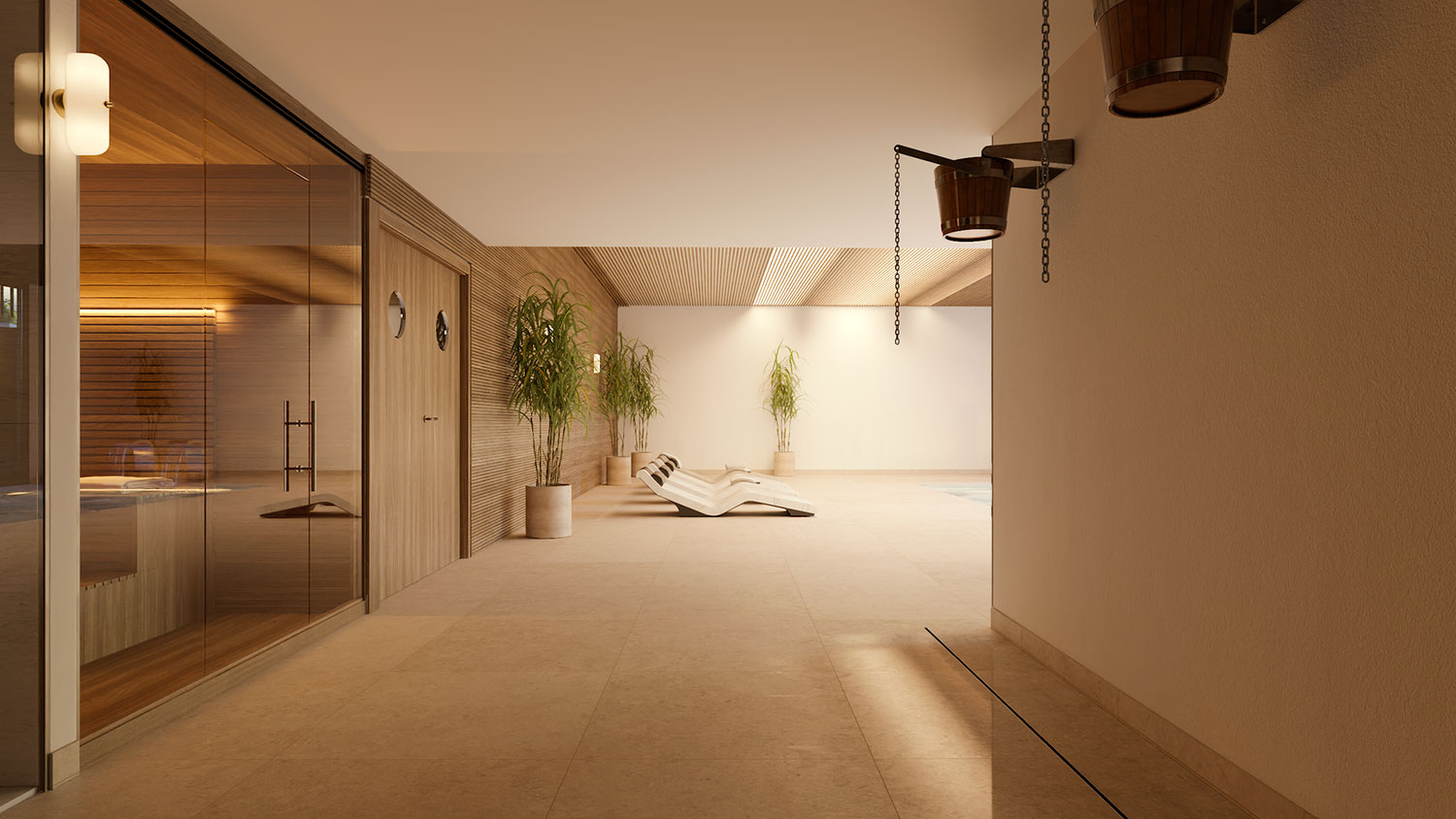 Een binnenruimte van ongeveer 280 m² met een wellnessruimte, sauna, Turkse stoombad, verwarmd overdekt zwembad, kleedkamers en fitnessruimte.
