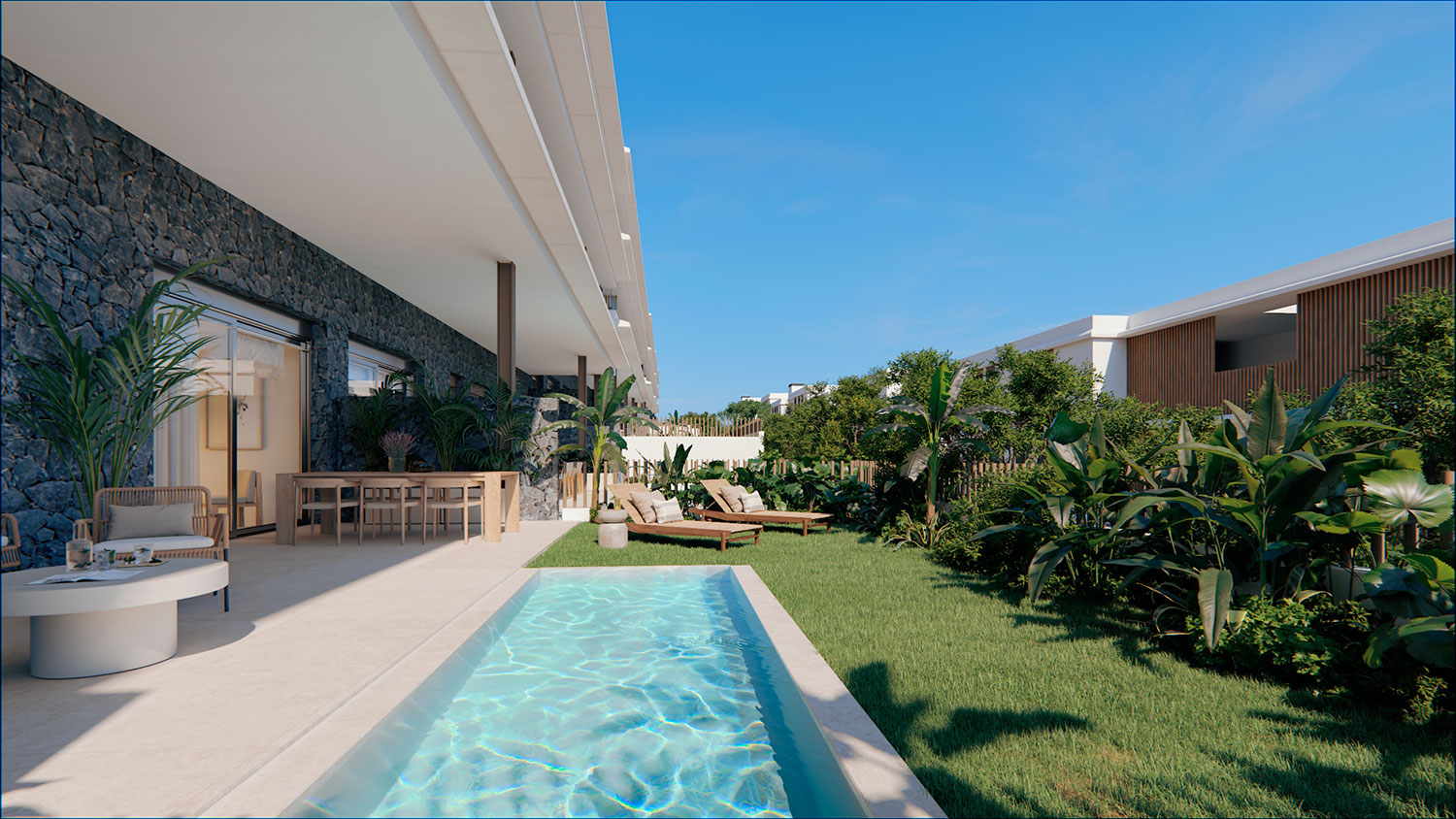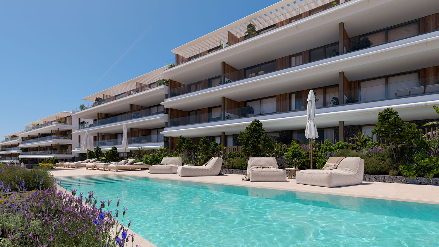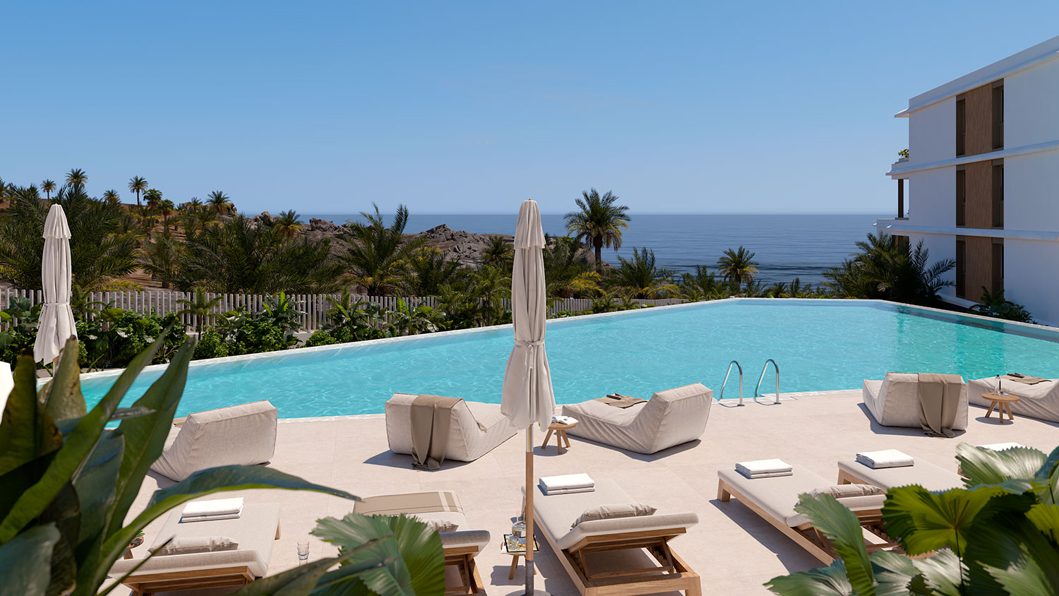 Elke woning vormt een natuurlijke verlenging van het landschap: terrassen met zicht op de blauwe lucht, interieurs vol zonlicht, en ruimtes die zachtjes in elkaar overvloeien, zoals de oceaan die je elke ochtend op enkele meters afstand begroet.