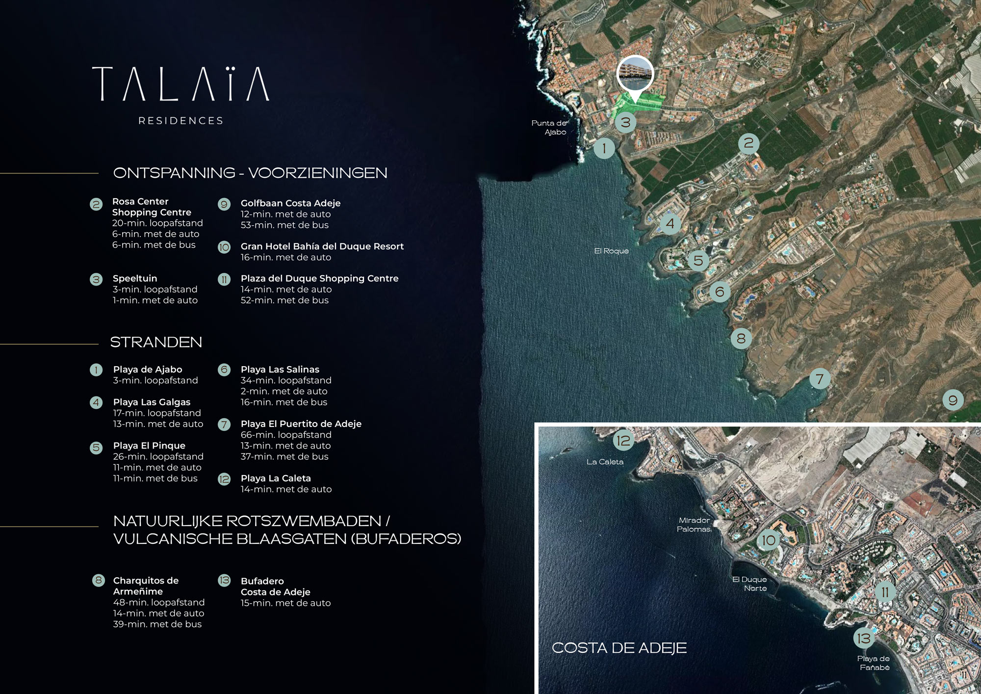 Costa Adeje, met zijn verfijnde gastronomie, golfbanen, jachthavens en hoogwaardige voorzieningen, ligt vlakbij. Maar de echte charme zit in het dagelijkse leven: een wandeling langs bloeiende bougainvillea’s, vers fruit van een nabijgelegen finca, een praatje met iemand die je elke ochtend begroet vanaf zijn terras. Dit is een plek waar het gemeenschapsgevoel nog leeft, waar luxe schuilt in eenvoud en in alles wat met zorg en vakmanschap is uitgewerkt.